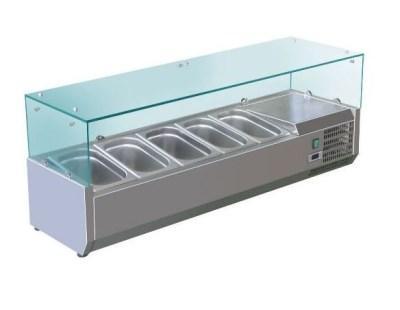 Chladící nástavba, kompletní nerezové provedení, skleněné krytí, nastavitelné nožičky, nerezová pracovní deska, elektronický regulátor, digitální ukazatel teploty, automatické odtávání elektrickým topením, chladivo R 134a, napětí 230 V/ 50 Hz. Chladicí nástavba na gastronádoby GN 1/4 vhodná pro pizzerie, rychlá občerstvení či menší provozovny. Náhrada je: Tefcold GVC33-120