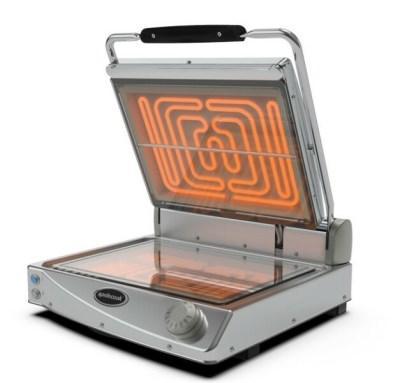 Kontaktní gril se sklokeramickou hladkou transparentní pečící deskou je ovládán manuálně za pomoci otočného regulátoru. Jedná se o jednodílný model, který se dokáže rychle nahřát do 90 sekund a má fast grill systém. Gril je robusní přístroj z nerezu a je dodáván s nožičkami a je možné jej umístit na pracovní plochu.