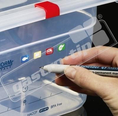 Vyrobeno s FDA - schváleného materiálu. Na nádobě je umístěn permanentní tvarově stálý štítek (technologie IML) K popisu štítku IML slouží speciálně dodávaný fix, který lze dokoupit za 25,- Kč bez DPH, jde jednoduše umýt v myčce nádobí.