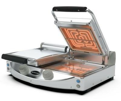 Kontaktní gril se sklokeramickou hladkou transparentní pečící deskou je ovládán manuálně za pomoci otočného regulátoru. Jedná se o dvoudílný model (má dva oddělené termosaty), který se dokáže rychle nahřát do 90 sekund a má fast grill systém. Gril je robusní přístroj z nerezu a je dodáván s nožičkami a je možné jej umístit na pracovní plochu. Má příkon: 2 kW