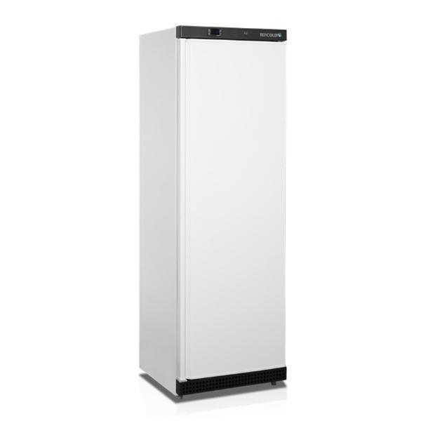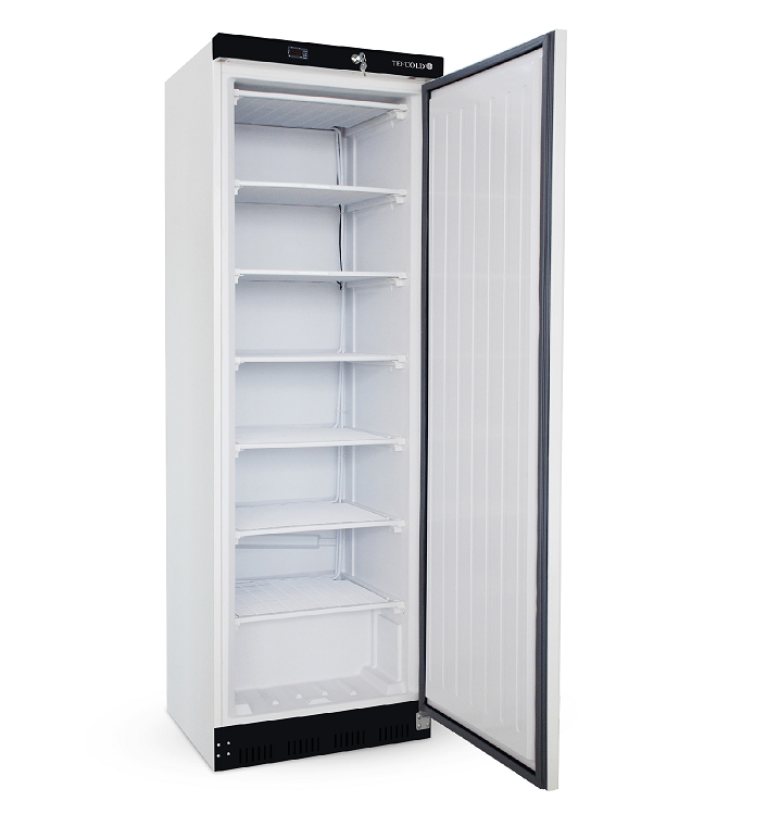 Mrazící skříň s plnými dveřmi, bílé provedení, statické chlazení, digitální termostat, 7 výparníkových roštů, zabudovaný zámek, snadno vyměnitelné těsnění