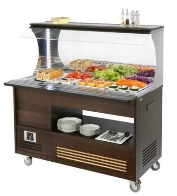 Salátový bar chladící SBM 40 F od francouzského výrobce ROLLER GRILL. Určen nejen pro samoobslužný systém obsluhy. Model určený pro umístění ke stěně, přístup z jedné strany. Zrcadlo na zadní části vozíku.