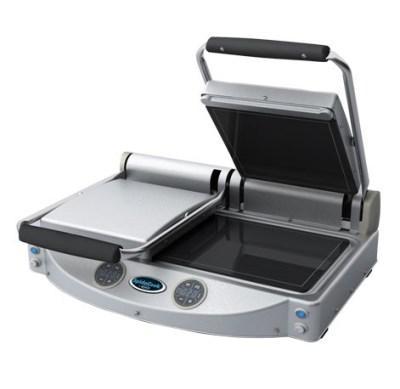 Ideální využití v rychlém občerstvení, ale i v běžných kuchyních. Kontaktní gril se sklokeramickou hladkou černou pečící deskou je ovládán digitálně. Jedná se o dvoudílný model (má dva oddělené termosaty), který se dokáže rychle nahřát do 90 sekund a má fast grill systém. Gril je robusní přístroj z nerezu a je dodáván s nožičkami a je možné jej umístit na pracovní plochu.