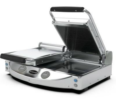 Ideální využití v rychlém občerstvení, ale i v běžných kuchyních. Kontaktní gril se sklokeramickou rýhovanou horní černou pečící deskou je ovládán digitálně. Jedná se o dvoudílný model (má dva oddělené termosaty), který se dokáže rychle nahřát do 90 sekund a má fast grill systém. Gril je robusní přístroj z nerezu a je dodáván s nožičkami a je možné jej umístit na pracovní plochu.