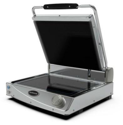 Ideální využití v rychlém občerstvení, ale i v běžných kuchyních. Kontaktní gril se sklokeramickou hladkou černou pečící deskou a má ovládání manuální. Jedná se o jednodílný model, který se dokáže rychle nahřát do 90 sekund. Gril je robusní přístroj z nerezu a je dodáván s nožičkami a je možné jej umístit na pracovní plochu. Má příkon: 2 kW