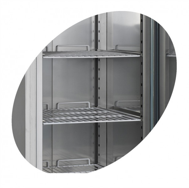 Mrazicí skříň s plnými dveřmi a nerezovým opláštěním, ventilované chlazení, lze vložit GN 2/1 nebo přepravku, zámek, samozavírací dveře, odolná kolečka.