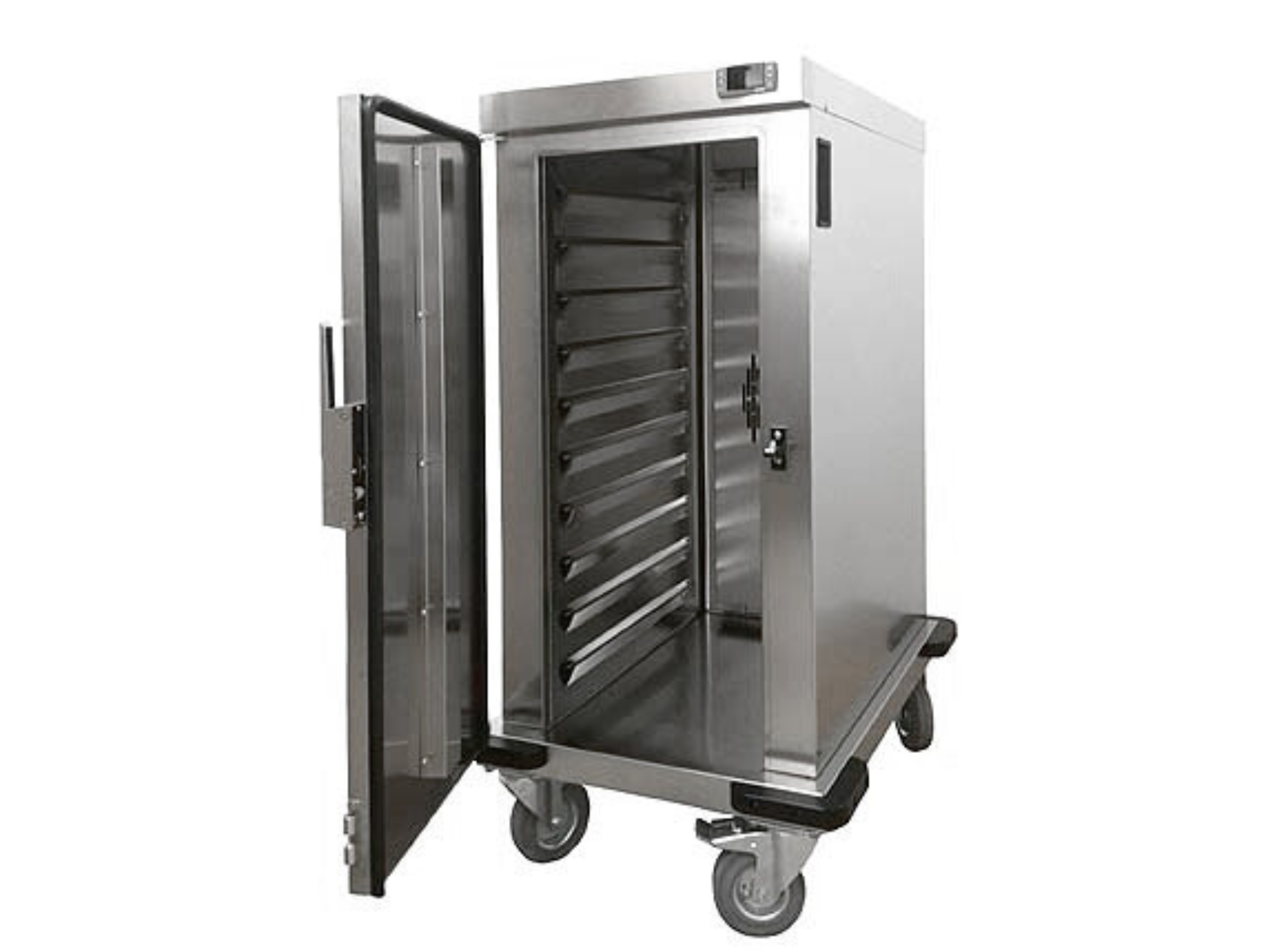 Transportní vozík s aktivním ohřevem vzduchu pro udržování stravy v gastronádobách.