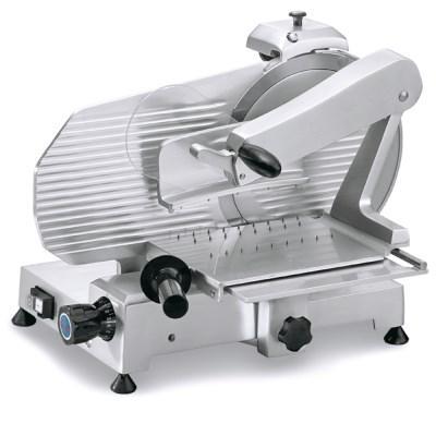 Nářezový stroj MIRRA 300 C VAS B.S. s teflonovým nožem o průměru 300 mm s uložením posuvného stolu rovně. Určen pro střední zátěž – 1 hod. provozu, 10 min. přestávka. Vhodný do bufetů, snack barů, malých a velkých restaurací a školních jídelen. Teflonový nůž umožňuje univerzální užití nejen ke krájení všech druhů uzenin, ale i na krájení předem vychlazených sýrů, ryb, chleba.