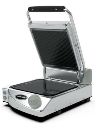 Ideální využití v rychlém občerstvení, ale i v běžných kuchyních. Kontaktní gril se sklokeramickou rýhovanou horní černou pečící deskou je ovládán manuálně za pomoci otočného regulátoru. Spodní opékací plocha je hladká. Jedná se o jednodílný model, který se dokáže rychle nahřát do 90 sekund a má fast grill systém. Gril je robusní přístroj z nerezu a je dodáván s nožičkami a je možné jej umístit na pracovní plochu.